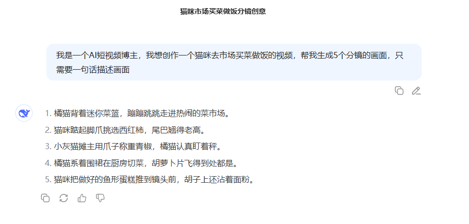 Step 1: Prepare Story Ideas Open the DeepSeek website: https://chat.deepseek.com/ Enter prompt words to ask the AI to generate story scene descriptions. For example: "I am an AI short video blogger, I want to create a video of a cat going to the market to buy vegetables and cook. Help me generate 5 scene descriptions, just one sentence description of the scene."